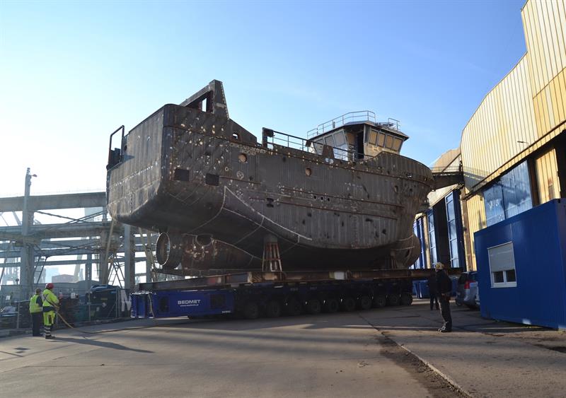 i zanurzenie – 3 m. Wyposażona będzie w ster, śrubę, echosondę i systemy rurarskie. W zeszłym tygodniu była transportowana do komory śrutowniczej Stoczni Szczecińskiej. Wodowanie ma się odbyć w połowie grudnia tego roku.