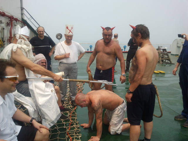 Powyżej: Chrzest na morzu. Seweryn w roli diabła.