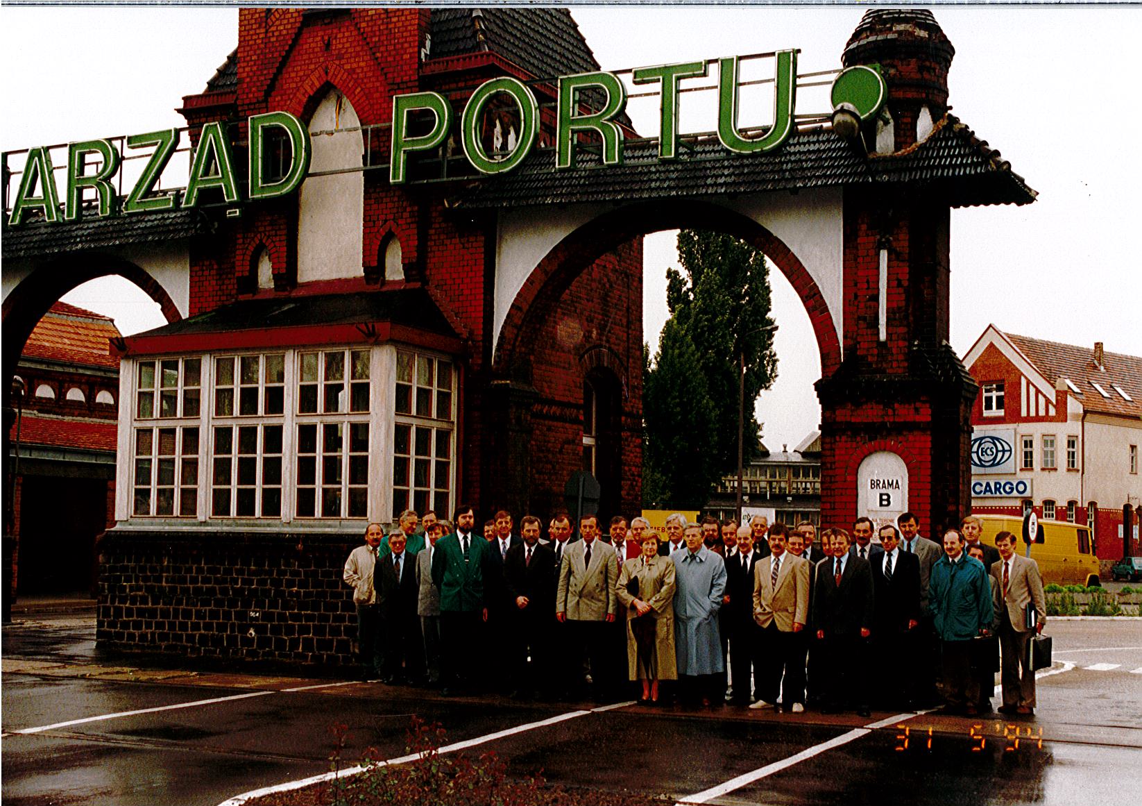 2) Ponad 20 lat temu w szczecińskim porcie przeprowadzono koncentrację kapitału. W maju 1994 r. do pamiątkowej fotografii ustawili się uczestnicy zjednoczeniowego spotkania.