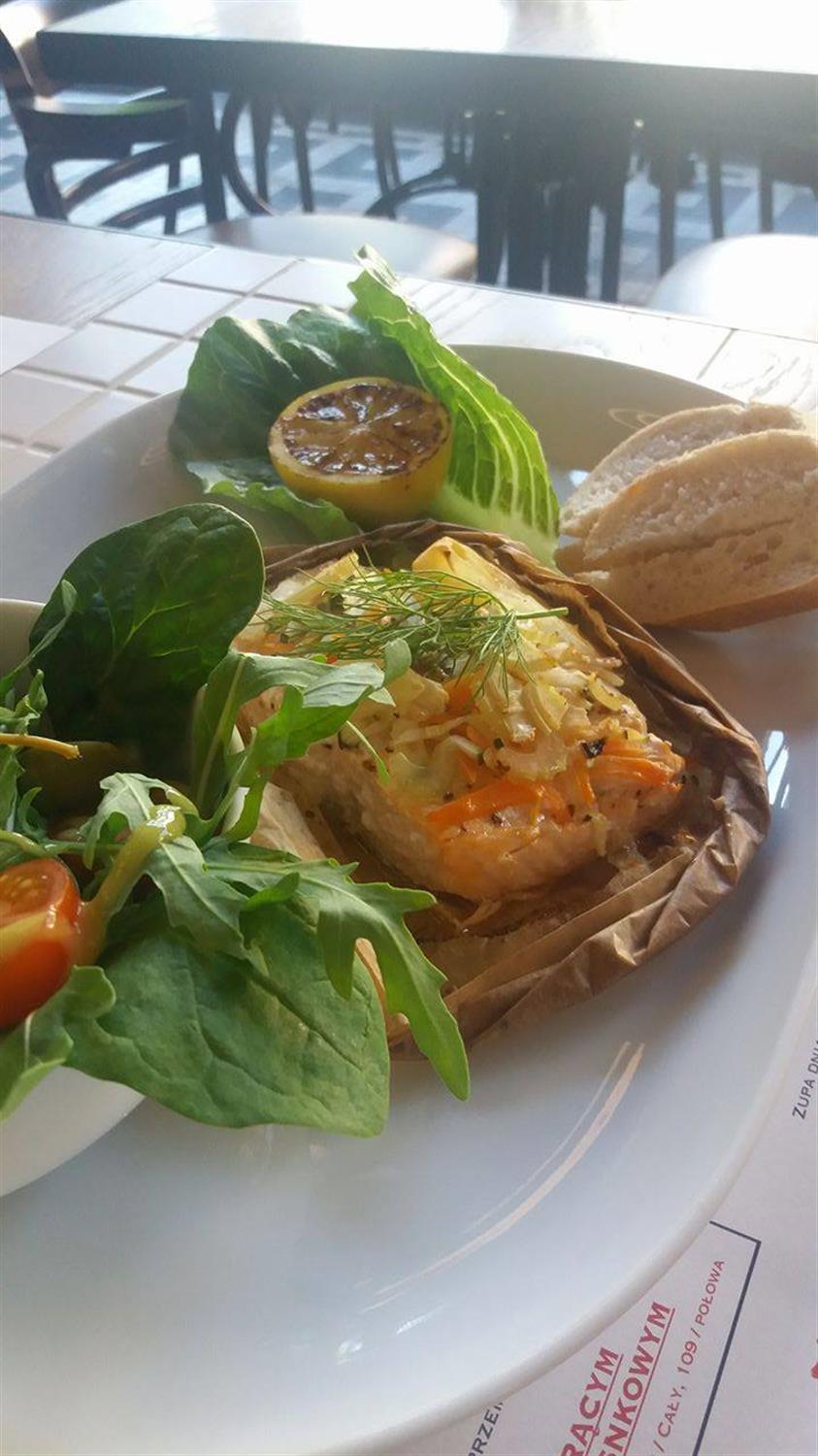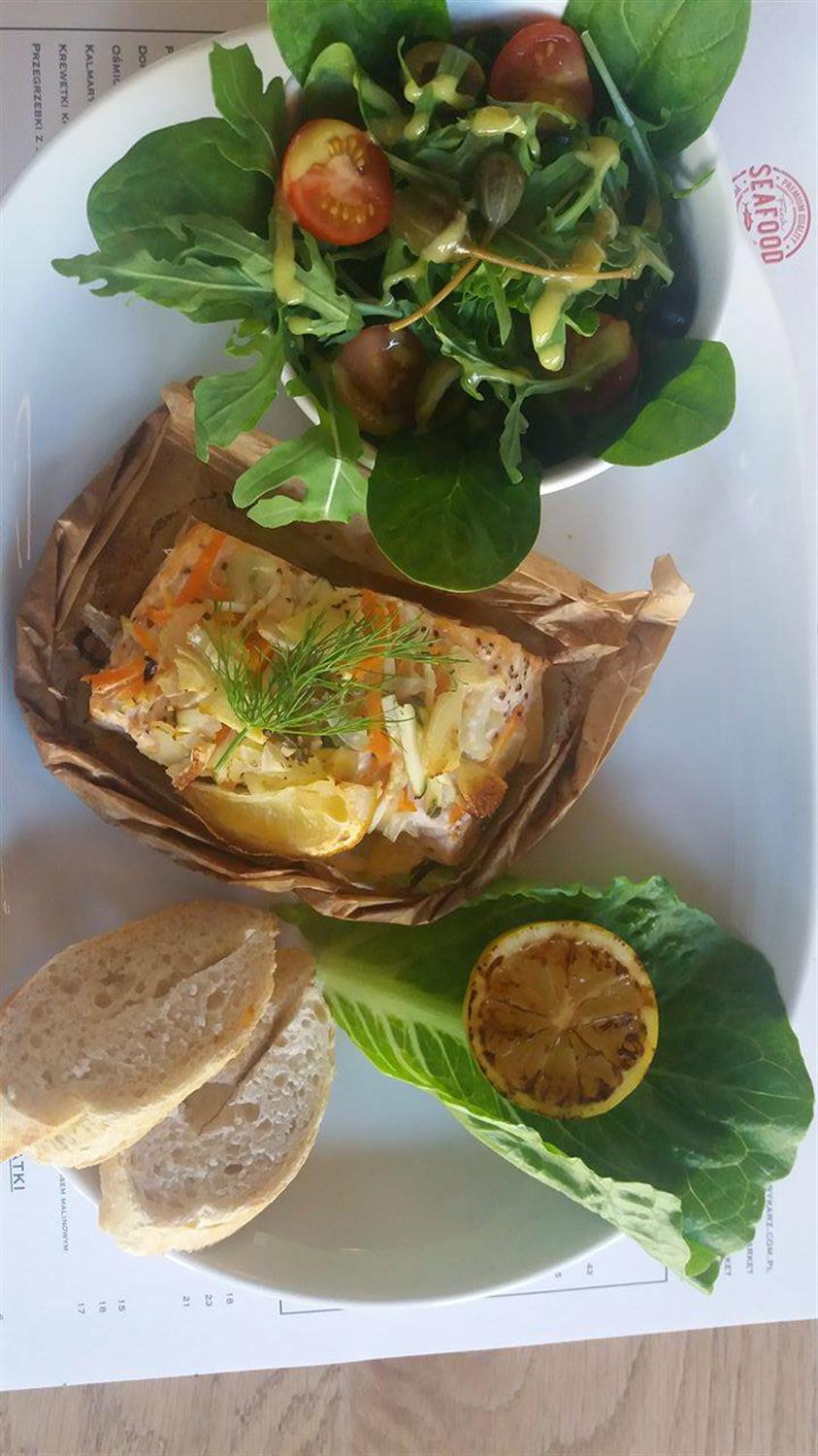 Łososia podajemy na talerz w pergaminie. Możemy dodać sałatę, pomidorka.