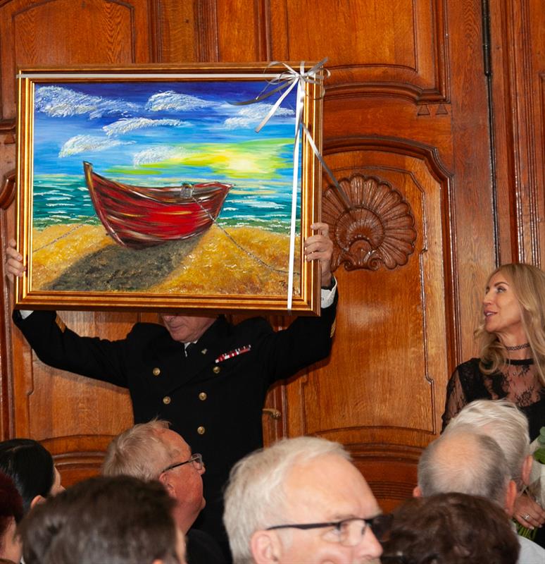 Profesor Weintrit wręczył w prezencie profesorowi Gucmie miniaturze statku z bursztynu.