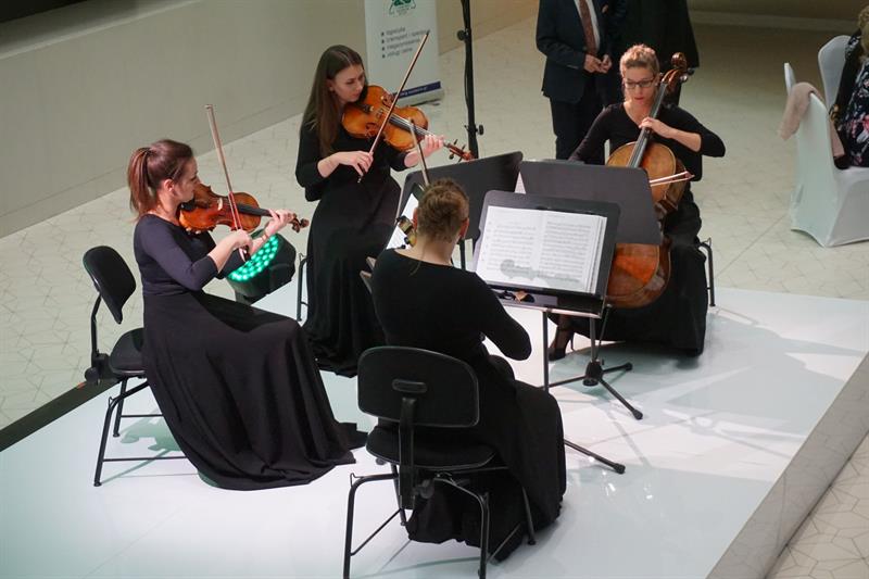 Gdy spedytorzy i ich goście nagradzali symfoników gromkimi oklaskami, w holu filharmonii czekało już kulinarne co nieco i tam przeniosło się życie towarzyskie. Białe obrusy, białe wnętrze a do tego muzyka grana przez Karłowicz Quartet. Szlachectwo zobowiązuje. ©℗