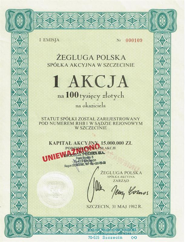 Przy okazji wymaganej ustawowo dematerializacji akcji Żegluga Polska SA (z Grupy Polskiej Żeglugi Morskiej) nadała status „unieważnione” starym, historycznym już akcjom spółki. Oryginały tych dokumentów zdecydowano przekazać – na pamiątkę – osobom związanym zawodowo z Żeglugą Polską oraz byłym członkom zarządu tej firmy.