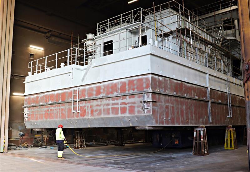 Kolejna barka na karmę dla ryb hodowlanych (tak zwany paszowiec) budowana jest przez firmę PTS Ltd, która korzysta z infrastruktury Stoczni Szczecińskiej. Konstrukcja ważąca ok. 220 ton w lutym trafiła do Ośrodka Czyszczenia i Malowania – najpierw do komory śrutowniczej, a następnie do komory malarskiej (na zdjęciu). Barka paszowa powiększy flotę norweskiej spółki Fluctus. Już wcześniej PTS wykonał dla niej podobne jednostki, mające po 30 m długości i 11 m szerokości.