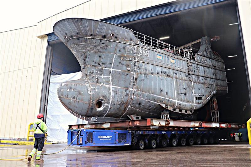 Na zdjęciach prezentujemy transport kadłuba do komory śrutowniczej Ośrodka Czyszczenia i Malowania Stoczni Szczecińskiej, a następnie wyjazd z komory malarskiej do ośrodka pochylniowego Wulkan, gdzie trwały ostatnie prace wykończeniowe przed wodowaniem.