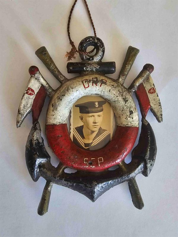 Kolejną zaprezentowaną pamiątką jest metalowa ozdobna plakieta pochodząca z okrętu podwodnego ORP „Sęp”, przedstawiająca nieznanego marynarza. Na odwrocie zdjęcia znajduje się dedykacja: „Na pamiątkę koledze razem spędzonych chwil w szkole – kolega Zuk, 04.03.1954 r.”.