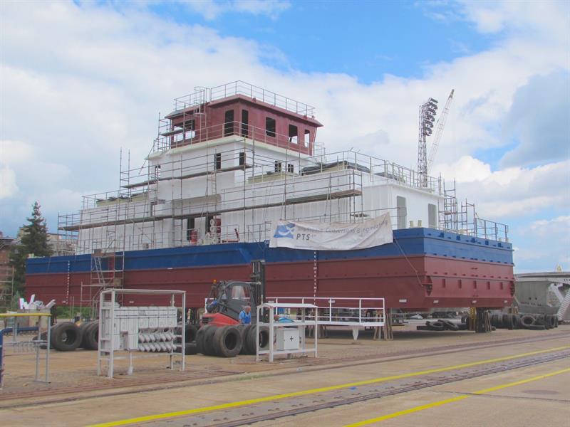 Tak zwany paszowiec (barka na karmę dla ryb hodowlanych), budowany przez firmę PTS dla spółki norweskiej, został kilka dni temu zwodowany na stoczniowej pochylni Wulkan (za pomocą suwnicy). Jednostka „Fluctus II” ma 30 m długości i 11 m szerokości. Na zdjęciu – jeszcze w trakcie końcowych prac przed wodowaniem.