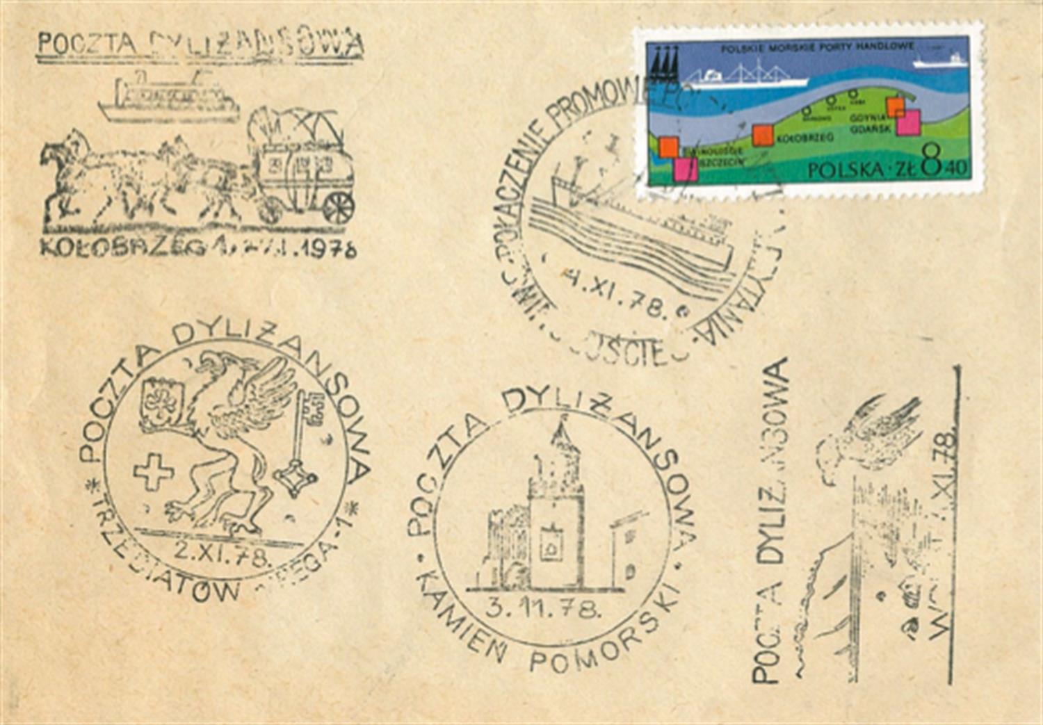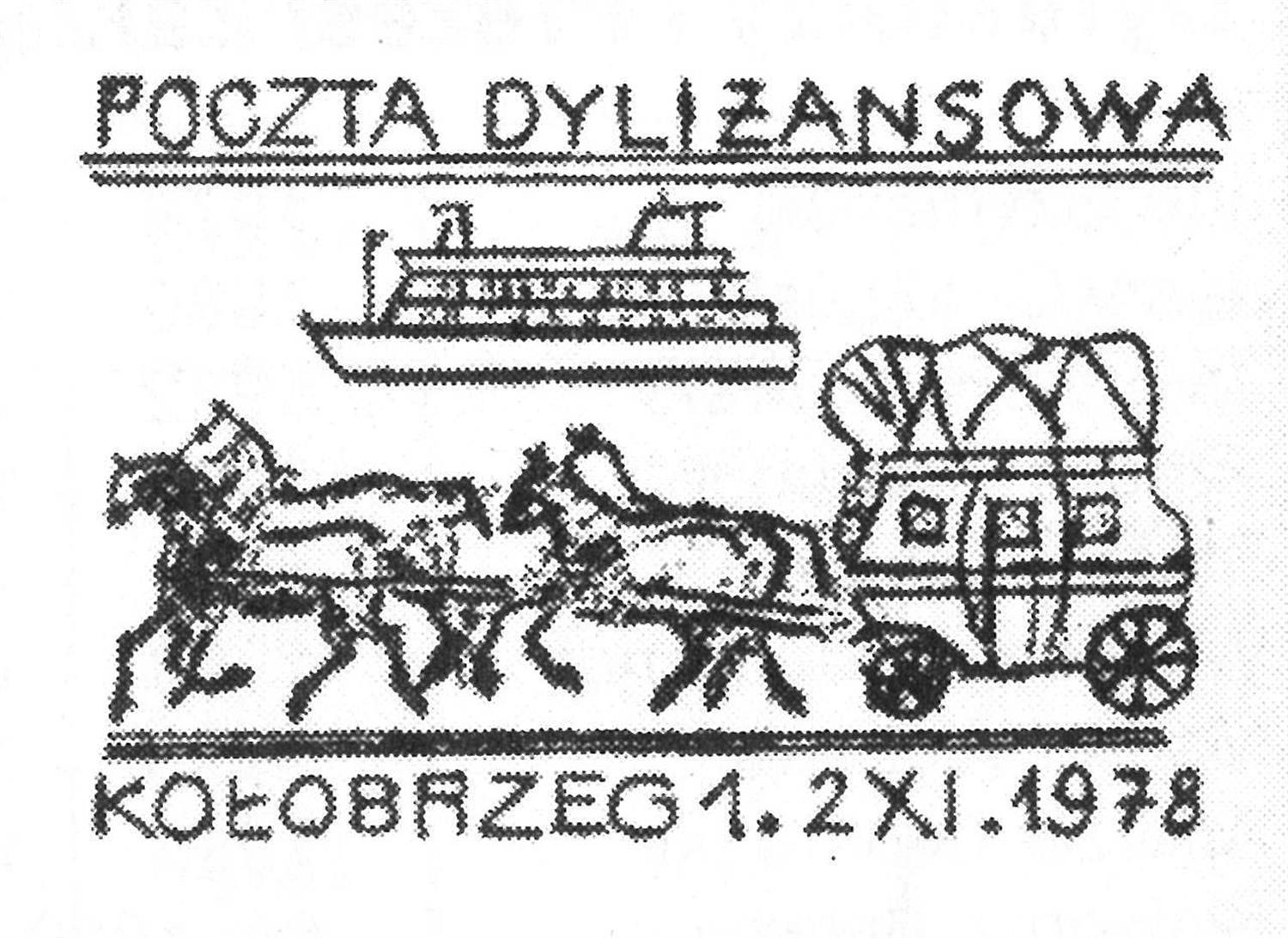 W połowie stycznia 1979 r. – zaproszony przez dyrektora – udaję się do siedziby Dyrekcji Poczty w Szczecinie. Dyrekcja w komplecie. Wymieniamy grzeczności o miłej współpracy przy organizowaniu dyliżansowej poczty – że owocna, rzeczowa i efektywna. Odbieram życzenia dalszych sukcesów pocztowo-żeglugowych. W pewnym momencie zaniemówiłem. A zdarza mi się to raczej rzadko. Oglądam plansze z zatwierdzonymi propozycjami okolicznościowego datownika. Czytam: „Poczta dyliżansowa Kołobrzeg 1,2.XI.1978”, i dalej: „Trzebiatów, Kamień Pomorski, Wolin, Świnoujście” i treść datownika: „Połączenie promowe Polska – Wielka Brytania 4.XI.1978”.