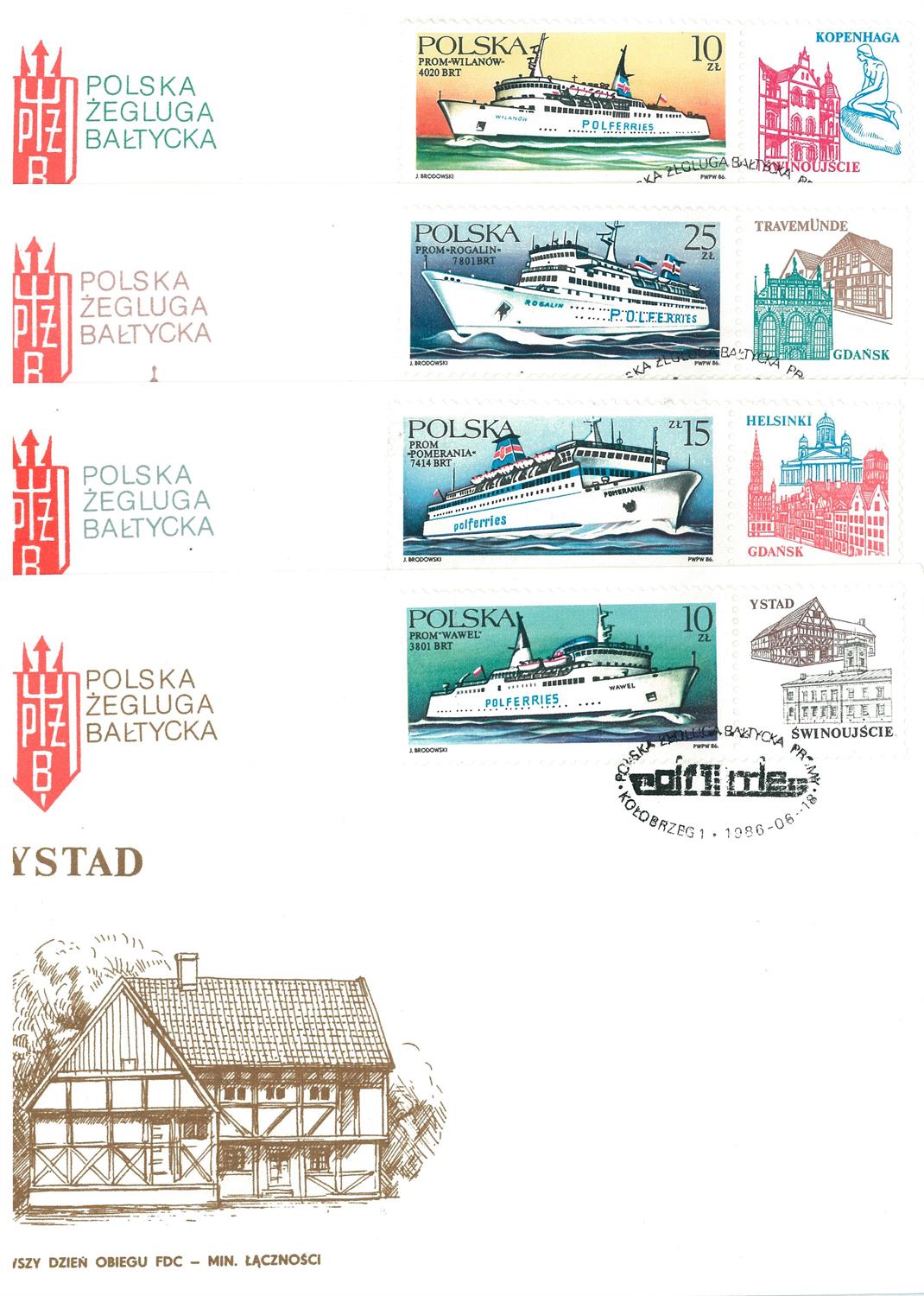 Życzenia dalszych sukcesów pocztowo-żeglugowych, jakie usłyszałem w 1979 roku w Szczecinie, spełniły się. W 1986 roku Poczta Polska emitowała cztery znaczki z promami kołobrzeskiego armatora. Treść stempla okolicznościowego na promach: „Skandynawia”, „Rogalin”, „Pomerania” i „Silesia” to reklama promująca Polską Żeglugę Bałtycką. A napis „Polferries” nadawał firmie znak jakości.