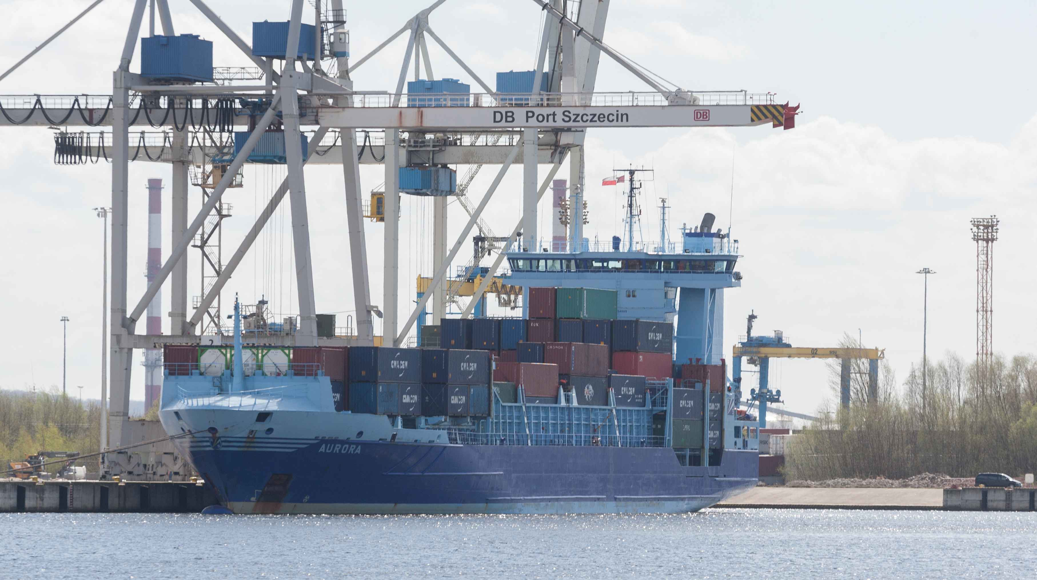 Na zdjęciu: Statek "Aurora" odbiera kontenery w szczecińskim porcie. Prawdopodobnie zawiezie je do Hamburga lub Antweprii, skąd popłyną dalej.