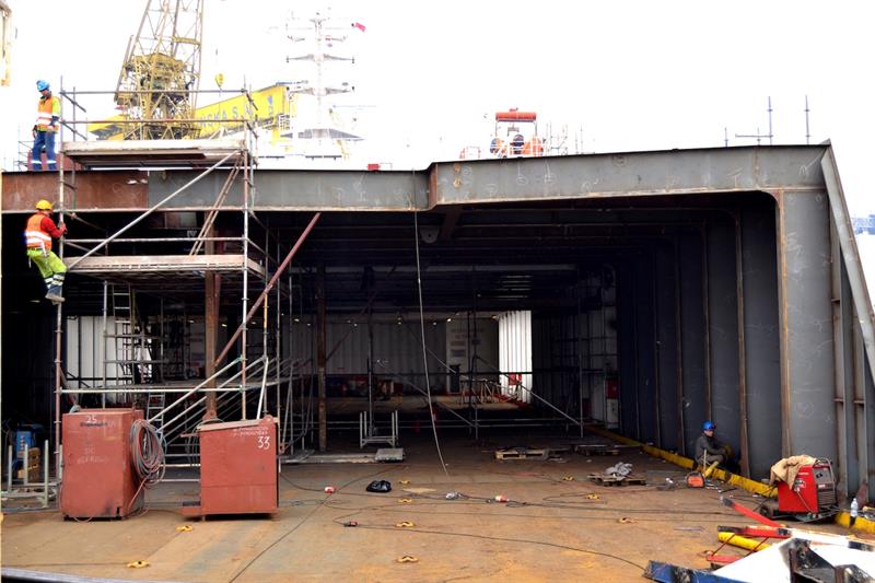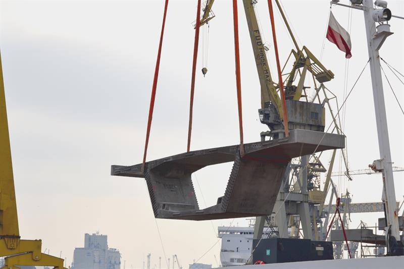 W kwietniu kontynuowane są przeładunki elementów mostu, produkowanych na terenie stoczni przez Mostostal Warszawa. Są to żelbetowe konstrukcje, ważące po ok. 100 ton, które zostaną wykorzystane do budowy mostu wysokowodnego w Danii. Łącznie Mostostal Warszawa ma wyprodukować 492 takie segmenty. Od marca br. po kolejne ich partie przypływają statki, które cumują przy Wulkanie. Konstrukcje przenoszone są z placu do ładowni za pomocą suwnicy bramowej o udźwigu 450 ton.