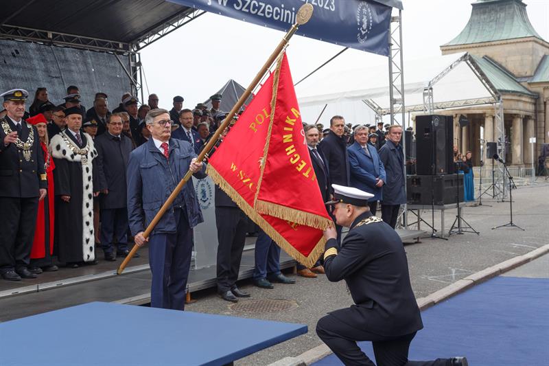 Wyjątkowym elementem tegorocznej inauguracji roku akademickiego na Politechnice Morskiej w Szczecinie była ceremonia pożegnania sztandaru Akademii Morskiej i przyjęcia sztandaru Politechniki, którego fundatorami są: Polska Żegluga Morska, Polska Żegluga Bałtycka, Wspólna Organizacja Interoceanmetal, Euroafrica Services Ltd., Unibaltic oraz Unity Line. Przedstawiciele tych firm w drzewce nowego sztandaru uczelni wbili pamiątkowe gwoździe. Na zdjęciu: dyrektor naczelny PŻM Andrzej Wróblewski trzyma sztandar Politechniki Morskiej, któremu cześć oddaje rektor PM Wojciech Ślączka.