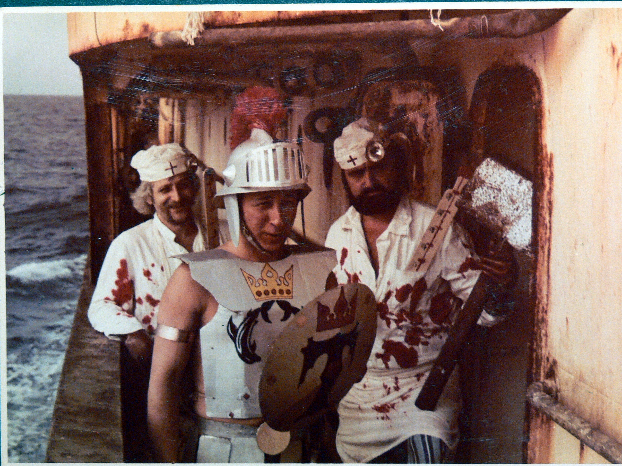 Nadszedł dzień chrztu. Niemal goli neofici oczekiwali z pokorą na królewski orszak. Neptun i jego małżonka pojawili się w otoczeniu diabłów. Wynurzył się także astrolog, lekarze, tryton, pirat, fryzjer. Mieli na sobie stroje lub zbroje wykonane ze znalezionych szmat i pomalowanych kartonów do pakowania mrożonej ryby.