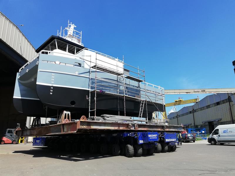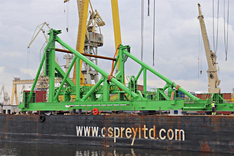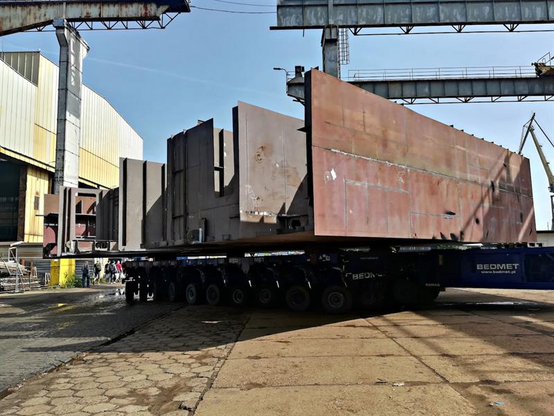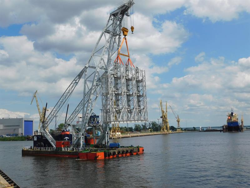 Na zdjęciu: Na pochylni „Wulkan” pod koniec maja odbył się załadunek grippera. Takie konstrukcje – chwytaki – są przydatne podczas transportu tzw. monopali (fundamentów morskich elektrowni wiatrowych) na specjalistycznych jednostkach pływających pomagających w budowie farm wiatrowych na morzu. Wykonawcą jest firma JW Steel Construction.