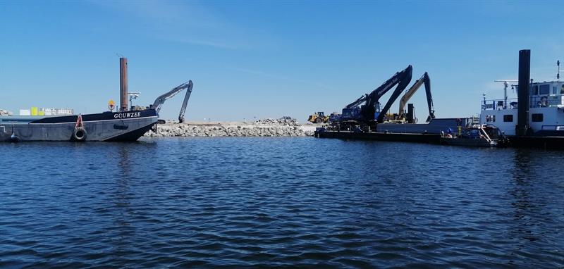 Jednym z zadań składających się na „Modernizację toru wodnego Świnoujście – Szczecin do głębokości 12,5 metra” jest budowa dwóch sztucznych wysp na Zalewie Szczecińskim. Na wyspie W22 (północnej) urobek jest odkładany rurociągami na jej obrzeżu, ponad powierzchnię wody. Trwa tam również montaż kamienia hydrotechnicznego do umacniania skarp podwodnych. Na zdjęciu: rozładunek kamienia i budowa umocnienia. W przypadku wyspy W28 urobek jest układany wewnątrz niej oraz rozpoczęto prace przygotowawcze pod roboty umocnieniowe. Obydwie zostaną obsadzone roślinnością, przy czym W22 będzie uformowana całkowicie i traktowana jako obszar środowiskowy, przeznaczony przede wszystkim dla ptaków. Druga z wysp jeszcze przez wiele lat ma służyć jako miejsce odkładania urobku.