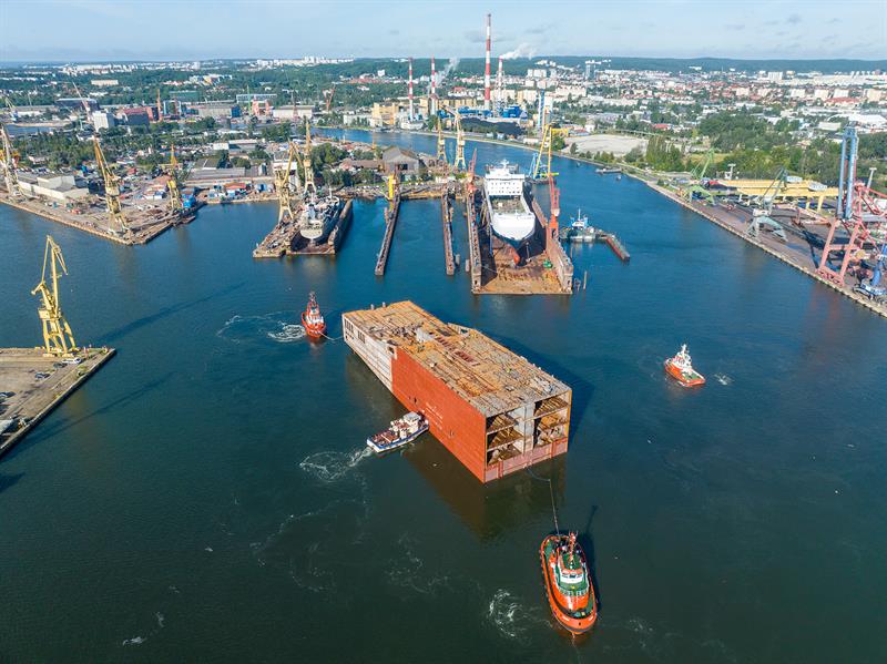 W Gdańskiej Stoczni Remontowej postępuje budowa promów dla Polskiej Żeglugi Morskiej. Kadłub pierwszej jednostki o symbolu NB101 konstruowany jest w sześciu blokach. Powstają one w różnych częściach stoczni. W tym miesiącu (9 sierpnia) przeholowano na pontonie główną część kadłuba złożoną z trzech scalonych już bloków, aby połączyć ją z innych gotowymi blokami w całość konstrukcji. Po złączeniu tych elementów kadłub będzie gotowy do wodowania i przejścia do fazy wyposażania. Jednostka ma być w pełni wyposażona i przygotowana do eksploatacji pod koniec przyszłego roku. Projekt realizowany jest w ramach rządowego programu „Batory”.