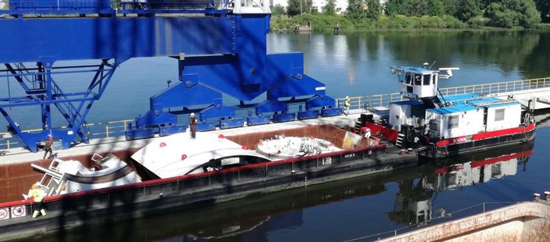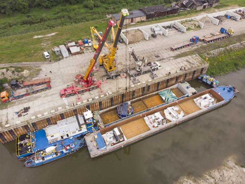 Z uwagi na duży rozmiar tarczy niektóre jej elementy były transportowane z Niemiec do Polski drogą wodną, a ściślej – śródlądowymi drogami wodnymi.