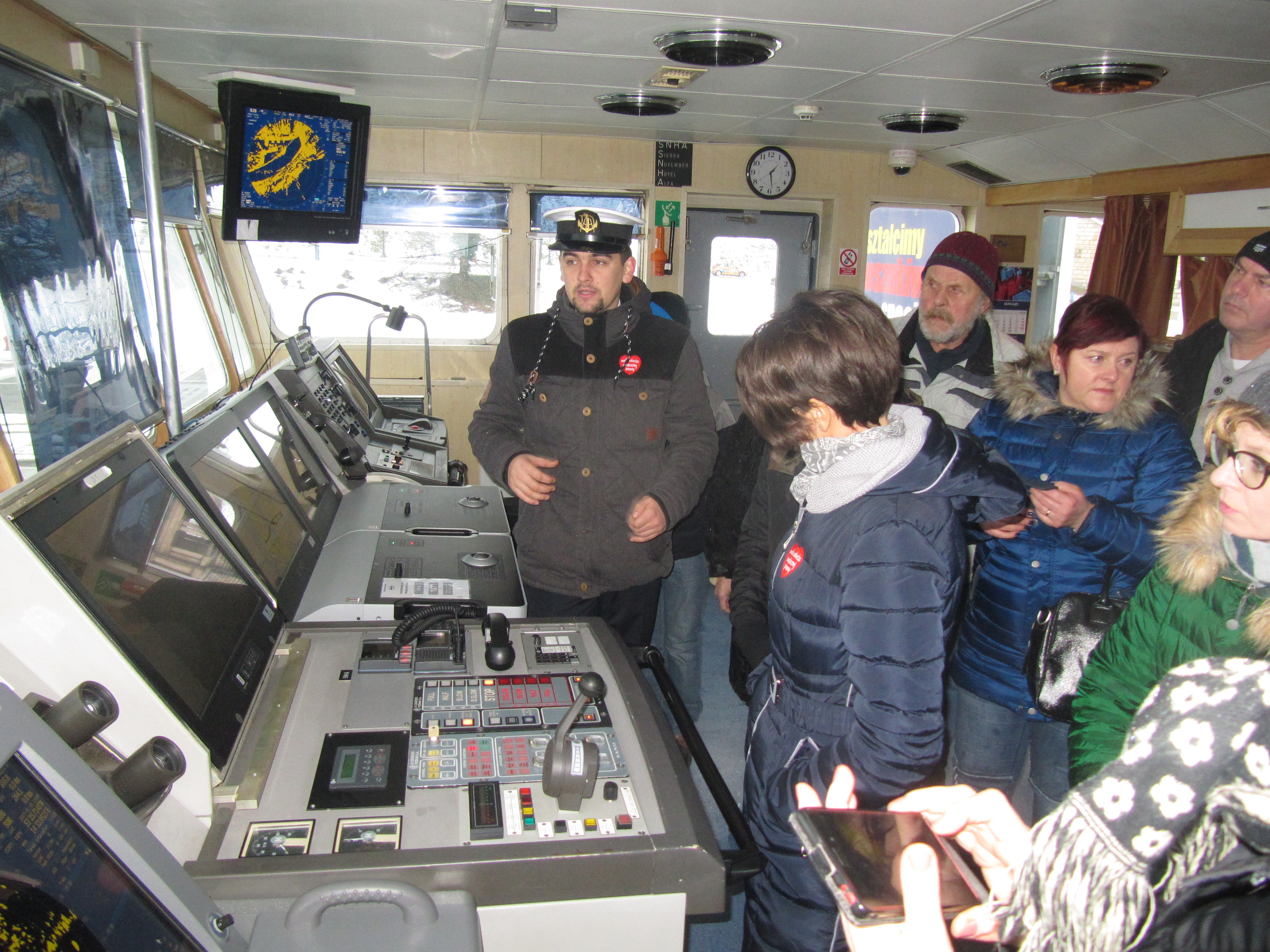 Kolejne zaprezentowane urządzenie to radar. Można było dostrzec na jego ekranie sylwetkę statku, zarys Wyspy Grodzkiej, Łasztowni, Trasy Zamkowej i nabrzeża Wałów Chrobrego. Centrala sterowania napędem pozwala natomiast sterującemu statkiem oficerowi precyzyjnie określić prędkość, z którą płynie jednostka do przodu lub do tyłu. W ten sposób steruje się potężnym silnikiem znajdującym się na dole, którego gabaryty są zbliżone do samochodu. Z mostku obsługuje się też ster strumieniowy. Jest to po prostu rura zamontowana w dziobie statku, przez którą zależnie od ustawienia silnik przepycha strumień wody w lewo lub w prawo. Dzięki temu można wykonywać precyzyjne manewry podczas przybijania do nabrzeża.