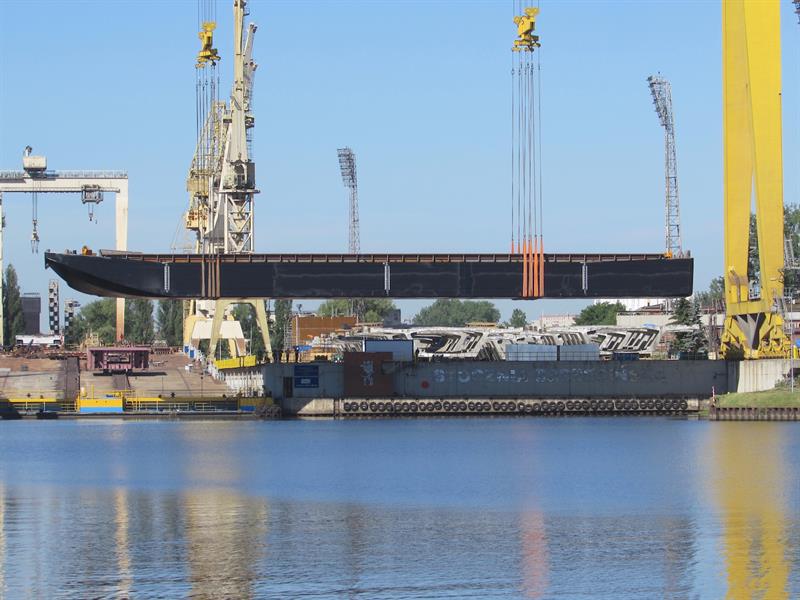 W ubiegły piątek (8 czerwca) na pochylni Wulkan w Stoczni Szczecińskiej zwodowano za pomocą suwnicy barkę pchaną typu Europa II a Leichter. Przeznaczona jest do transportu rudy i węgla po Renie. Jednostka ma 76,5 m długości i niecałe 11,5 m szerokości. Wyposażona jest w windę kotwiczną na rufie i dziobie z napędem silnika Diesla oraz w ręczne windy cumownicze – po dwie na dziobie i rufie. W części dziobowej znajduje się opuszczana płetwa steru z napędem pneumatycznym (kontrola z pchacza). Barki te pływają w zestawach do pięciu sztuk (jedna za drugą).