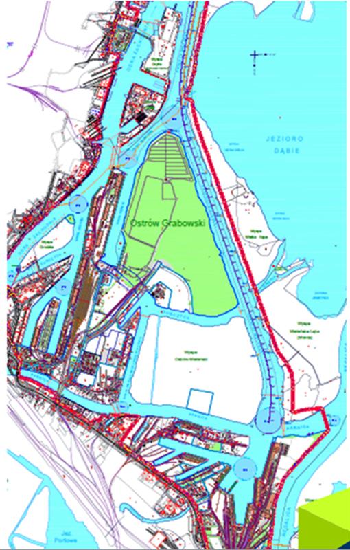 Tor wodny: Obszar Ostrowa Grabowskiego zlokalizowany na wysokości 64 000 km toru wodnego Świnoujście – Szczecin, pogłębionego do głębokości technicznej 12,5 m i poszerzonego do 100 m.