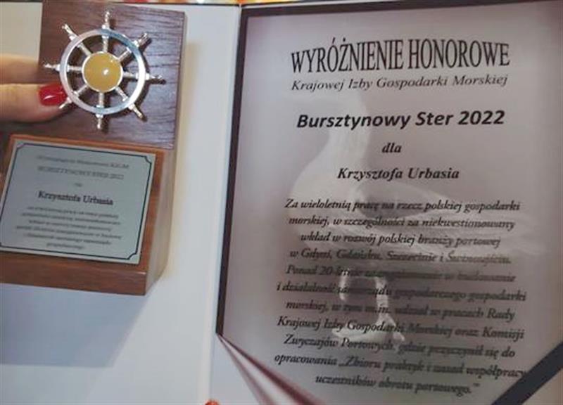 Z kolei „Bursztynowym Sterem”, nagrodą przyznawaną osobie fizycznej zasłużonej dla gospodarki morskiej, uhonorowano Krzysztofa Urbasia – za wieloletnią pracę na rzecz polskiej gospodarki morskiej, w szczególności za niekwestionowany wkład w rozwój polskiej branży portowej w Gdyni, Gdańsku, Szczecinie i Świnoujściu. Doceniono też jego ponad 20-letnie zaangażowanie w budowanie i działalność samorządu gospodarczego gospodarki morskiej, w tym m.in. udział w pracach Rady Krajowej Izby Gospodarki Morskiej oraz Komisji Zwyczajów Portowych, gdzie przyczynił się do opracowania „Zbioru praktyk i zasad współpracy uczestników obrotu portowego”.