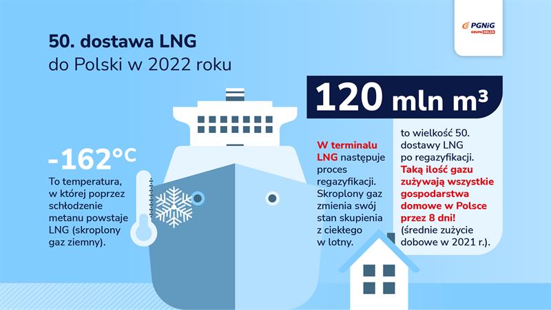 PKN Orlen odebrał pięćdziesiątą dostawę skroplonego gazu ziemnego dostarczoną w tym roku do terminalu w Świnoujściu. To o 20 ładunków więcej niż w tym samym okresie 2021 roku. Intensyfikacja dostaw LNG pozwoliła zabezpieczyć surowiec dla odbiorców krajowych pomimo trudnej sytuacji na europejskim rynku gazu.