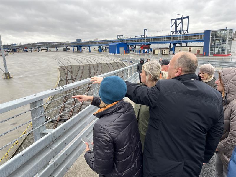 Uczestnicy spotkania, w tym przedstawiciel CINEA, obejrzeli elementy zmodernizowanej i rozbudowanej infrastruktury TPŚ objętej umową o dofinansowanie, czyli: połączone nabrzeża 5 i 6, rampę i galerię pasażerską, place postojowo-manewrowe, estakadę je łączącą, zmodernizowany system torów kolejowych i nowo zakupiony sprzęt do przeładunku jednostek intermodalnych.