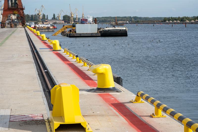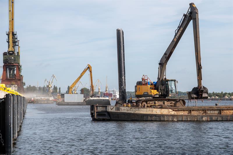 11 sekcji, tj. ok. 220 m nabrzeża. Na nabrzeżu Fińskim, które ma 300 m długości, zostały zamontowane nowe odbojnice. Za nim jest wykonane praktycznie całe nabrzeże Norweskie, pozostała do wykończenia tylko jedna sekcja. Za nabrzeżem Norweskim mamy ok. 750 m obudowy brzegu, która w przyszłości będzie nabrzeżem Duńskim. Tam prace hydrotechniczne są zakończone, trwa tylko zakładanie drewnianych belek odbojowych, co w ciągu miesiąca, dwóch będzie wykonane. Jeżeli chodzi o roboty czerpalne w Kanale Dębickim, one również są mocno zaawansowane. Cały czas pracuje pogłębiarka. Do wyczerpania było 1,5 mln m sześc. urobku, który trafia na pola odkładu na Ostrowie Grabowskim i Ostrowie Mieleńskim. Wydobyto ok. 800 tys. m sześc.