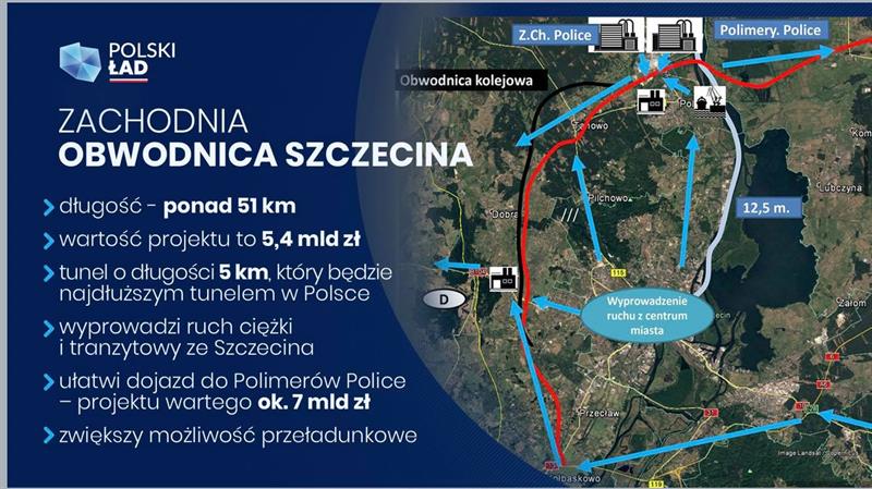 Zaznaczył, że wielkie inwestycje przemysłowe potrzebują bardzo sprawnej infrastruktury. Ta natomiast wiąże się z możliwie dobrym systemem dróg i kolei. Wskazał przy tym na strategiczny projekt komunikacyjny, czyli ponad 50-kilometrową obwodnicę zachodnią Szczecina z najdłuższym w Polsce (pięciokilometrowym) tunelem. Koszt tej inwestycji szacowany jest na 5,5 mld zł.
