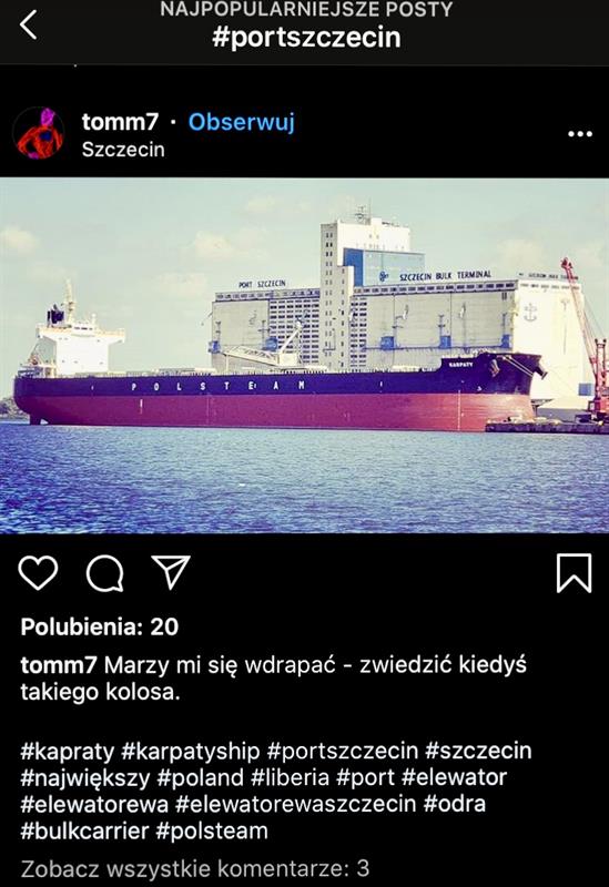 tomm7 zatytułował swój wpis „Marzy mi się wdrapać – zwiedzić kiedyś takiego kolosa”. Pytanie, o którego kolosa chodzi, elewator Ewa czy m/s Karpaty? Elewator ma w najwyższym miejscu 64 m wysokości, co odpowiada wysokości 18-piętrowego budynku. Karpaty to panamax, największy z masowców we flocie szczecińskiego PŻM (długość – 228,99 m, szerokość – 32,26 m). Gratulujemy fajnego ujęcia!