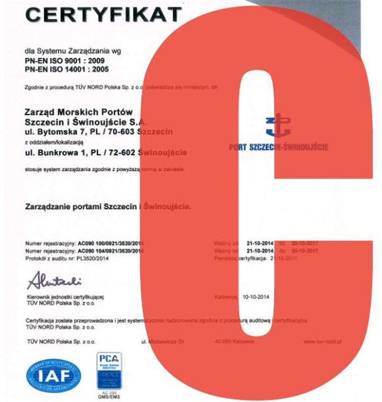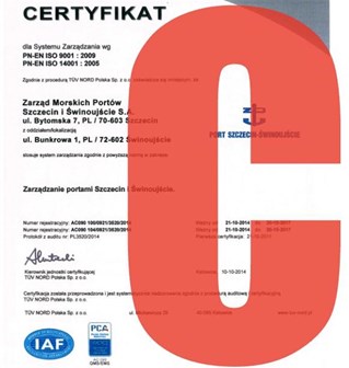 Wynikiem pozytywnym zakończył się audyt recertyfikujący spółki. Audytorzy zewnętrzni wysoko ocenili funkcjonowanie systemu zarządzania. Potwierdzili to przyznaniem Certyfikatu TÜV NORD CERT z międzynarodową akredytacją TGA na kolejne trzy lata. Oznacza to, że działalność spółki jest oparta na wysokiej jakości oraz dbałości o środowisko naturalne. ZMPSiŚ uzyskał Certyfikat Zintegrowanego Systemu Zarządzania Jakością według normy EN ISO 9001:2008 oraz Systemu Zarządzania Środowiskowego według normy EN ISO 14001:2004 blisko dekadę temu – 19 października 2011 r. – jako pierwszy zarząd morskich portów w Polsce.