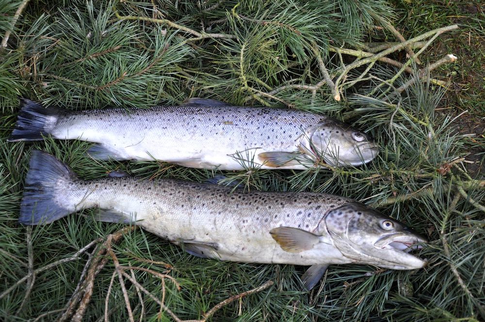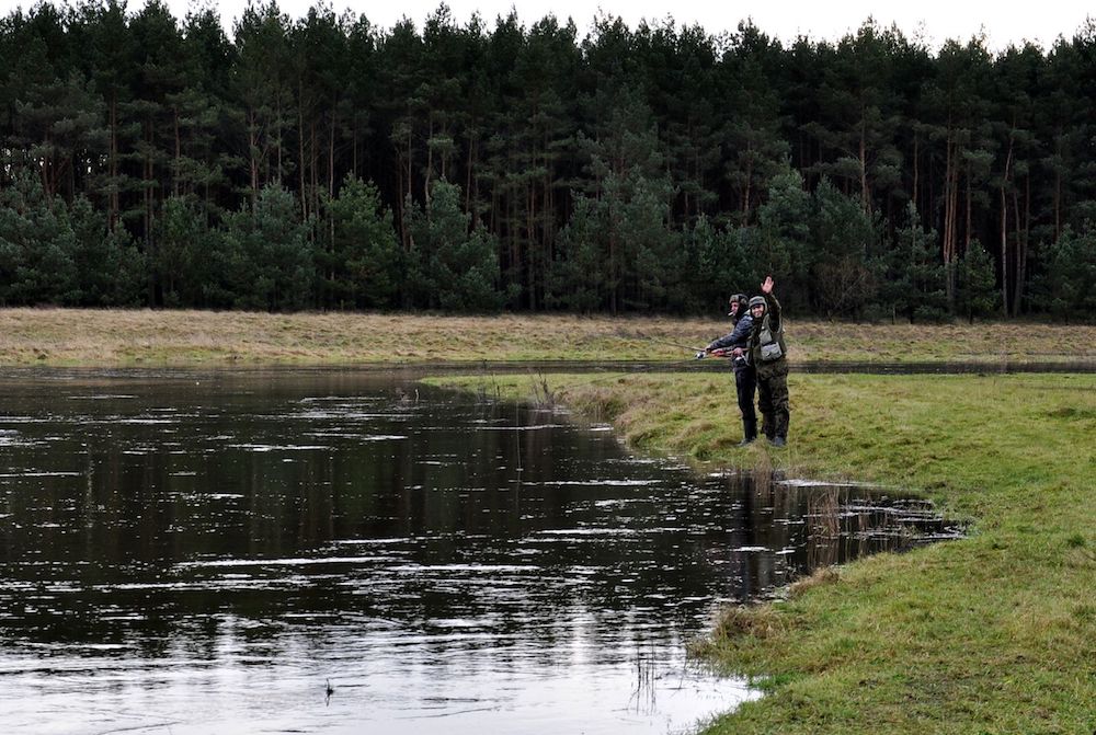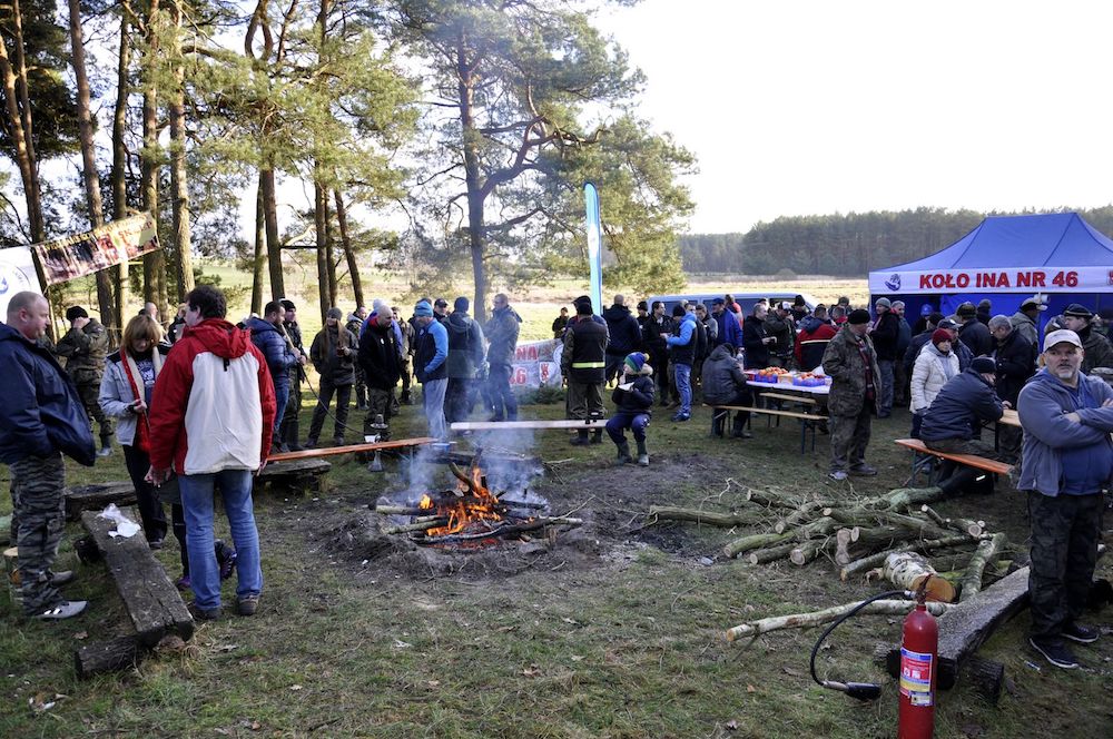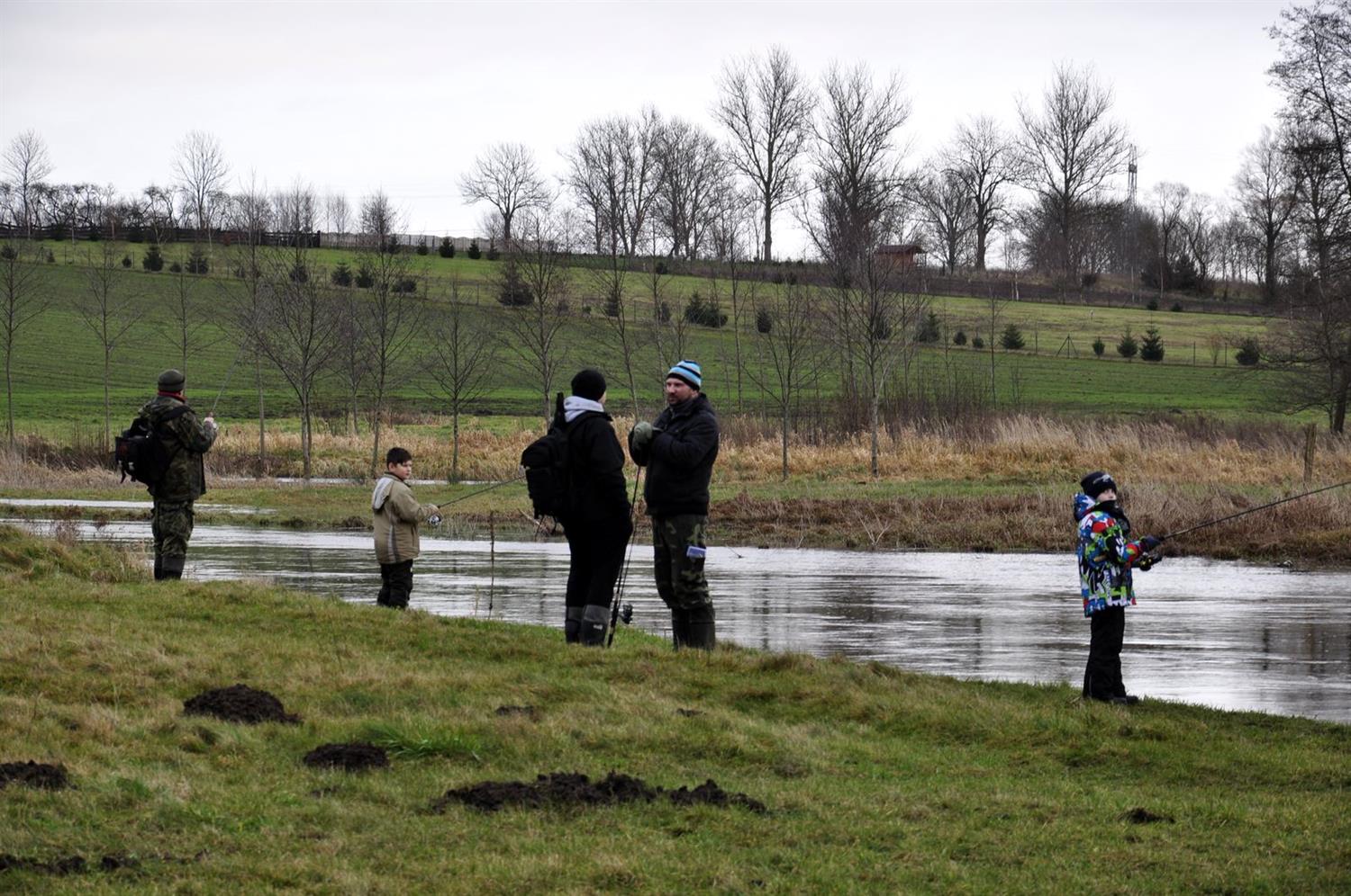 To naprawdę dużo! Długie opady deszczu spowodowały, że w rzece stan wody był na tyle wysoki, iż w wielu miejscach wylewała się nawet poza koryto. Jeden z wędkarzy, który przyjechał nad Inę aż znad Parsęty, powiedział mi jednak, że u niego jest jeszcze gorzej. No, ale nie ma co narzekać. I tak spinningi cięły powietrze, aż miło było słuchać. Jeszcze przed oficjalnym zakończeniem zmagań było wiadomo, że padły trzy trocie. Jedna z nich po zmierzeniu pozowała jeszcze chwilkę do zdjęcia i wróciła do wody. Dwie kolejne, samca i samiczkę mogliśmy podziwiać, kiedy ułożono je na przygotowanym wcześniej podłożu z gałązek sosny. Na polanie, gdzie organizatorzy rozbili namiot i ustawili kilka stołów, kiedy tam dotarłem, płonęło już spore ognisko. Można było wypić gorącą herbatę i kawę. Nieco później była już grochówka z wkładką, kiełbaski z rożna i gorący barszczyk. Odpalenie petardy zasygnalizowało zakończenie zmagań.