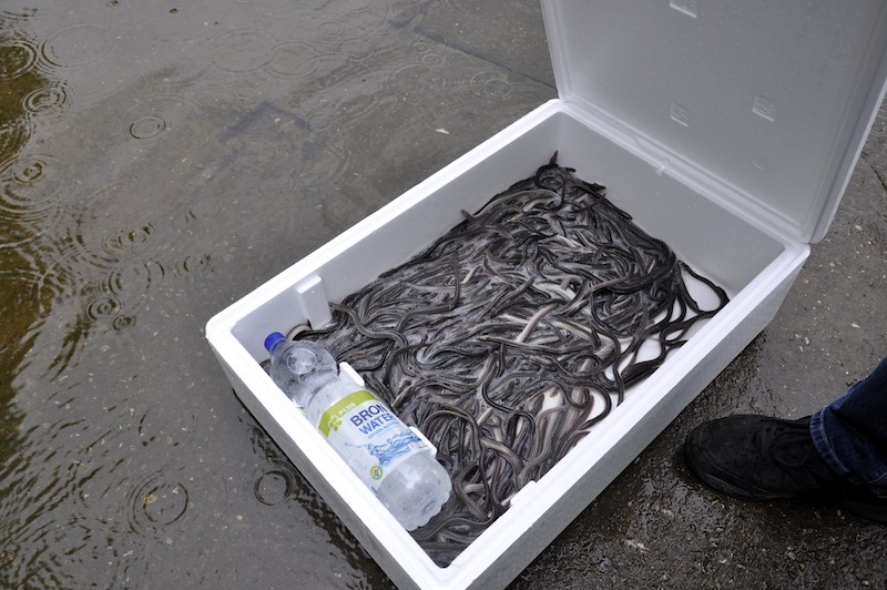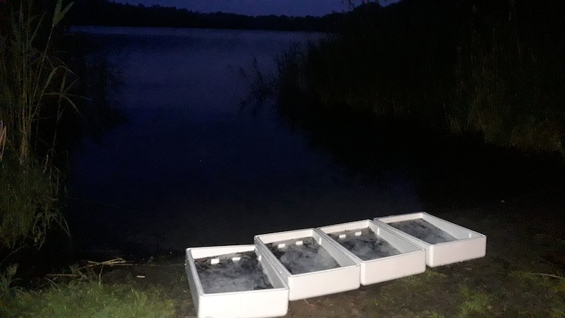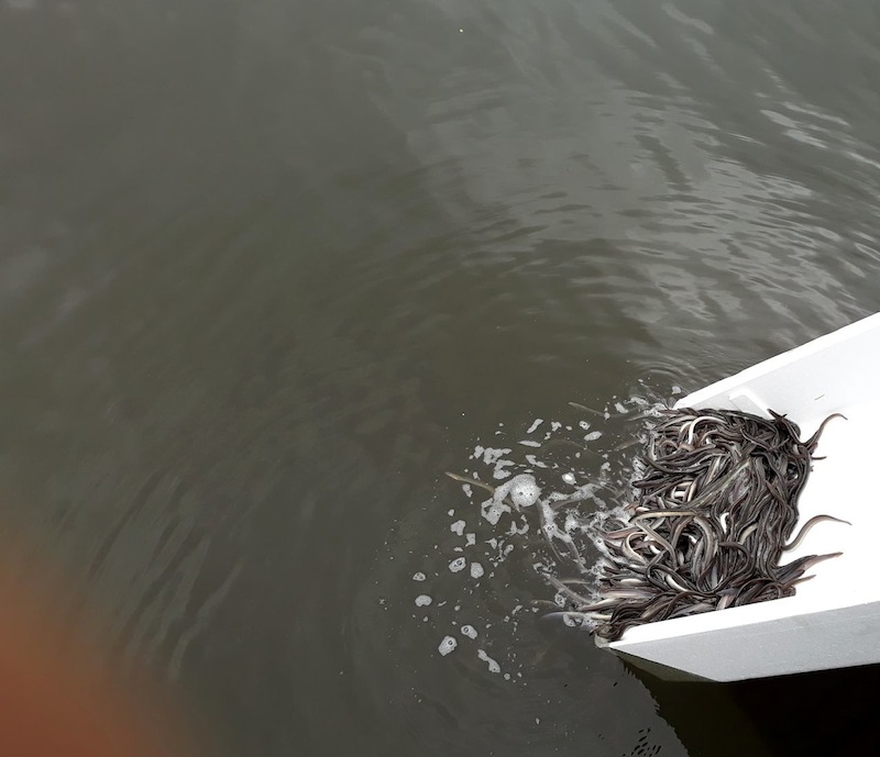 Jak na ironię, maluchy wpuszczane do naszych wód muszą żerować i dorastać kilka lat zanim osiągną minimum 60 centymetrów długości, abyśmy mogli je łowić. Te, które nie padną łupem wędkarzy, po osiągnięciu dojrzałości płciowej robią wszystko, aby dotrzeć do Morza Sargassowego i odbyć tam tarło. Nieco później giną. Ale wracajmy do zarybienia. Najpierw w specjalnych styropianowych opakowaniach węgorzyki przyjechały samochodem prosto z Danii. Nie były duże, bo sięgały około 20 centymetrów i ważyły zaledwie 10 gramów. Był to jednak tak zwany węgorz montee, ale większy narybek podchowany. Przy współpracy z kołami PZW naszego okręgu wpuszczono ich do wody dość dużo, bo ponad 300 kilogramów. Łatwo policzyć, że to ponad 300 tysięcy sztuk. Gdzie trafiły? Wpuszczono je między innymi do jezior: Morzycko, Kołczewo, Żółwino, Śniatowo, Sierakowo, Okonie, Szczucze, Czarne, Rokity, Sicina, Chociwel, Tychowo, Grabowo i Nowogardzkie.