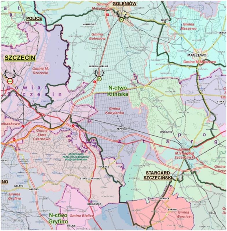 Lasy Nadleśnictwa Kliniska położone są w sąsiedztwie dużych aglomeracji miejskich, jakimi są miasta: Szczecin, Stargard i Goleniów, przez które przebiegają i które łączą podstawowe ciągi komunikacji drogowej oraz kolejowej. Powyższe uwarunkowania antropogeniczne mają bezpośredni niekorzystny wpływ na środowisko leśne oraz istotnie wpływają na skalę realizowanych postępowań związanych z rozwojem społecznym skutkującym potrzebą ingerencji w środowisko leśne. W konsekwencji często prowadzi do nieodwracalnych zmian planistyczno-urbanistycznych w zakresie przeznaczenia gruntów leśnych na cele nieleśne i ich trwałego wyłączenia z produkcji leśnej.