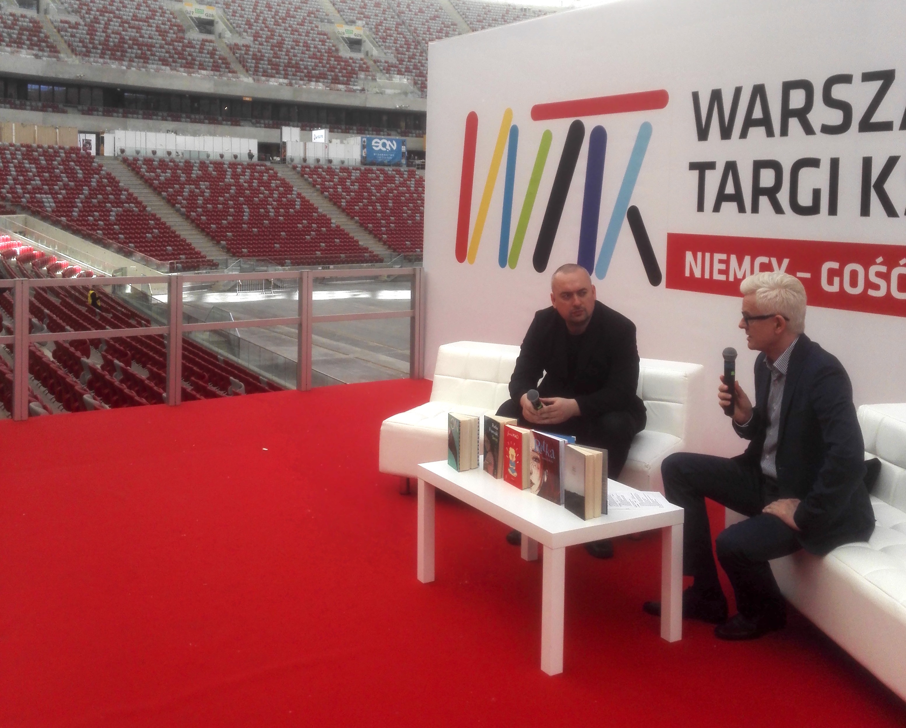 Na zdjęciu: Profesor Robert Cieślak, juror "Gryfii" i Alan Sasinowski sekretarz literacki nagrody dla autorki ogłaszają nazwiska tegorocznych finalistek podczas Targów Książki w Warszawie.