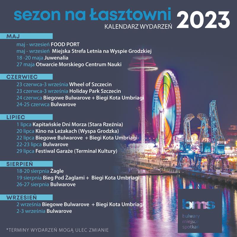 Najważniejszą imprezą tego lata będą oczywiście Żagle 18–20 sierpnia. U stóp Wałów Chrobrego i na Łasztowni zacumują jednostki, które przypłyną do Szczecina z gościnną wizytą. Spodziewanych jest m.in. kilkanaście żaglowców z Polski, Niemiec, Finlandii i Holandii. Wśród atrakcji różne strefy aktywności dla dzieci i rodzin, Festiwal Orkiestr Dętych, a także koncerty na scenach głównej i szantowej. Dla odwiedzających dostępny będzie Jarmark pod Żaglami wraz ze strefą Food Trucków i Strefa Artystów. Od kilku lat stałą i cieszącą się olbrzymim zainteresowaniem odwiedzających atrakcją jest Craft Beer Zone, gdzie można skosztować rzemieślniczych browarów z całej Polski.
