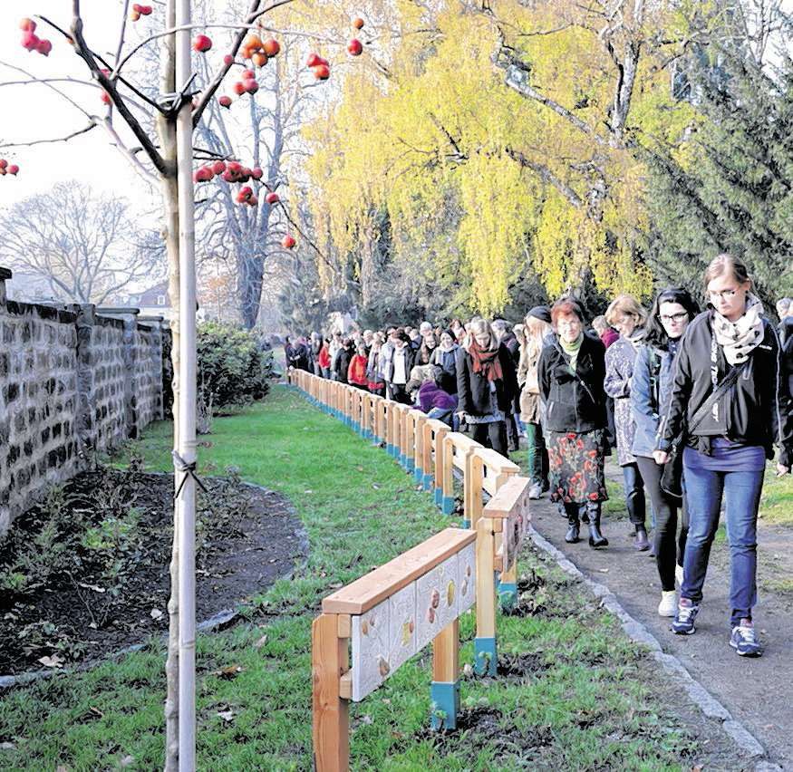 Uczniowie drezdeńskich szkół przeszukali archiwa i znaleźli nazwiska dzieci. Zajmowali się także losem ich rodziców, poznawali mechnizmy nazistowskiej przemocy. Potem każdy z nich przygotował dla jednego dziecka symboliczny, wykonany przez siebie nagrobek. Wszystkie utworzyły pomnik, liczący 90 metrów.
