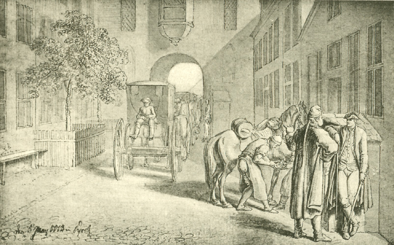 W podróż wyruszył konno, rankiem 3 czerwca 1773 r. W jednym z rysunków utrwalił pożegnanie z żoną i dziećmi, sportretował Polaka, stajennego, który towarzyszył mu w drodze. Zatrzymywał się m.in. w dzisiejszych Pyrzycach (rysował fragmenty miasta), jego droga wiodła przez Stargard (rysował m.in. ówczesną noclegownię), zahaczył o Nowogard, gdzie w szczegółach utrwalił młyn wodny, Karlino, Koszalin. Szkicował spotkanych ludzi, przyrodę, wioski, miasta, uwiecznił kaszubski zajazd, wieczorne rozmowy przy winie, przedmieścia Gdańska (Oliwę).