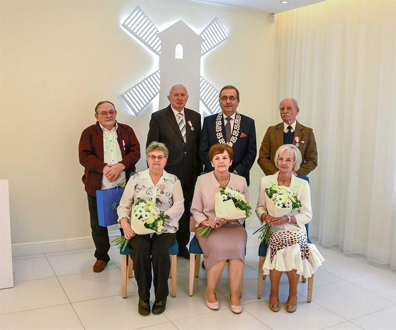 Prezydent Miasta Janusz Żmurkiewicz uhonorował trzy pary szczęśliwych Jubilatów medalem przyznawanym przez głowę państwa za długoletnie pożycie małżeńskie. Pół wieku (a nawet trochę więcej) przeżyli wspólnie: Regina i Zenon Kazikowscy, Maria i Zdzisław Pawełczyk, Ewa i Zbigniew Przybylscy. Gratulujemy!