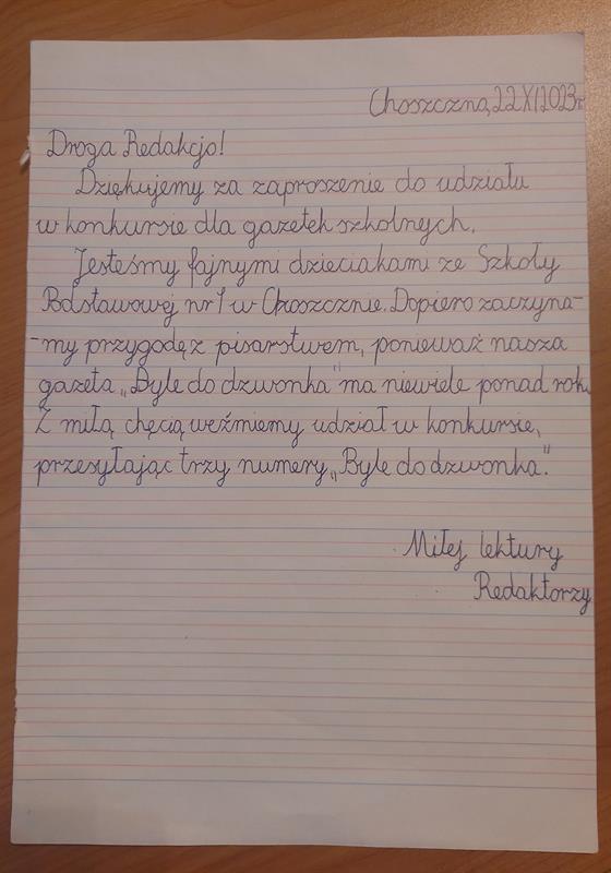 – Droga redakcjo, dziękujemy za zaproszenie do udziału w konkursie dla gazetek szkolnych. Jesteśmy fajnymi dzieciakami ze Szkoły Podstawowej nr 1 w Choszcznie. Dopiero zaczynamy przygodę z pisarstwem, ponieważ nasza gazeta „Byle do dzwonka” ma niewiele ponad rok. Miłej lektury! – koperta z trzema egzemplarzami pisma, która dotarła do naszej redakcji, zawierała także list od nastoletnich dziennikarzy.