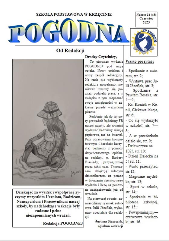 Nie trzeba zgadywać skąd wzięła się jej nazwa, wszak Szkoła Podstawowa mieści się przy ul. Pogodnej, na dodatek - jak to opisywał na lamach „Kuriera Szczecińskiego" wieloletni opiekun „Szkolnego Pulitzera" red. Bogdan Twardochleb - Krzęcin to bardzo pogodna gmina pełna potężnych lasów, licznych jezior, a latem słońca. Od 2009 roku, czyli przez 14 lat pismo redagowało wielu uczniów krzęcińskiej podstawówki, jednak wraz z rozpoczęciem nowego roku szkolnego 2023/2024 za jego wydawanie odpowiedzialny jest już całkiem nowy zespół redakcyjny, który właśnie przygotowuje 46 - jesienny numer. Jeszcze przed wakacjami, w czerwcu opiekę nad szkolnym kołem dziennikarskim przejęła Justyna Staszczyk, nauczycielka historii i wiedzy o społeczeństwie.