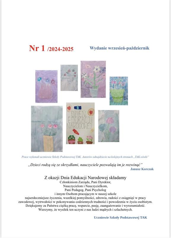 Dziś prezentujemy „TAK-sówkę”, pismo, które redagują uczniowie Niepublicznej Szkoły Podstawowej „TAK” w Szczecinie: najmłodsi z klas I – III przede wszystkim zamieszczają rysunki i inne prace plastyczne, teksty piszą uczniowie klas IV – VIII. Niezmiernie się cieszmy, że ubiegłoroczny debiutant stanie w tym roku po raz drugi w konkursowe szranki. Kołem dziennikarskim redagującym „TAK-sówkę” opiekują się nauczycielki Elżbieta Perdek, polonistka oraz Małgorzata Abramczuk-Pajor, ucząca informatyki. W piśmie nie brakuje wywiadów, recenzji, relacji ze szkolnych wycieczek i wydarzeń, które uczniowie dokumentują licznymi zdjęciami. Na łamach gazetki czytelnicy znajdą także stałe rubryki: kącik poezji i ten poświęcony domowym pupilom dzieci oraz krzyżówki, szarady, rebusy autorstwa samych uczniów podstawówki.