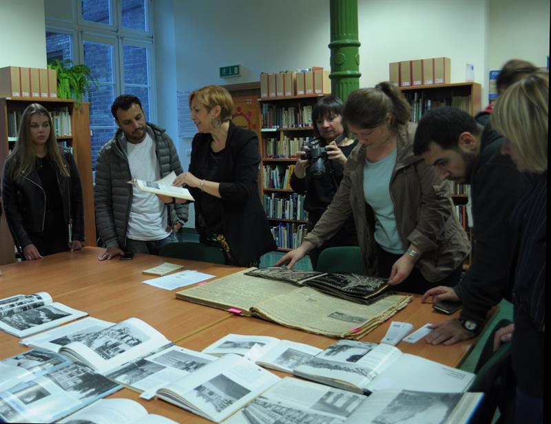 Książnica Pomorska. Sylwia Wesołowska (Dział Pomorzoznawczy) opowiada imigrantom i uczniom IX LO o czasach nazistowskich w Szczecinie, gdy żył i działał Hermann Stöhr. Na stole szczecińskie gazety z sierpnia i września 1939 r. Fot. Aleksandra KOZIOŁ
