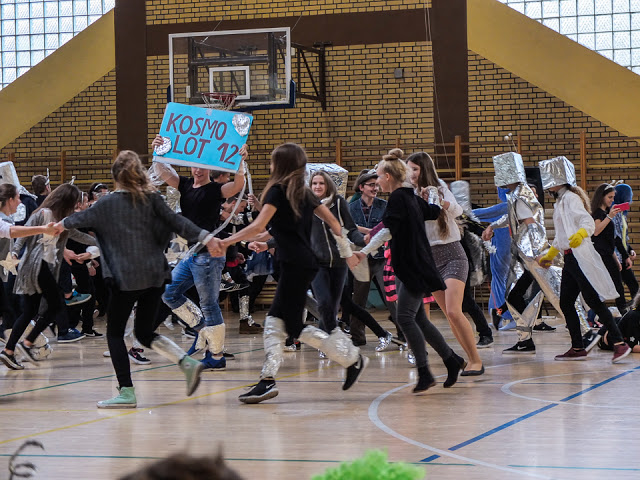 zaprezentować kosmiczne. Później był jeszcze kosmiczny taniec. Następnie nadszedł czas na inwazję kosmitów. Po kolei każda klasa, która przebrana była za istoty nie z tej ziemi, chodziła po środku sali tańczyła w rytm muzyki. Po prezentacji strojów i ruchów kosmicznych dyrektor wraz z innymi jurorami ocenili pomysłowość uczniów i przyznali nagrody trzem najlepszym klasom. Wygrały- 1e, 2b, 3d. Po skończonym apelu uczniowie rozeszli się do klas, w których mieli wykłady albo oglądali filmy. Wszystko skończyło się o godzinie 13:20