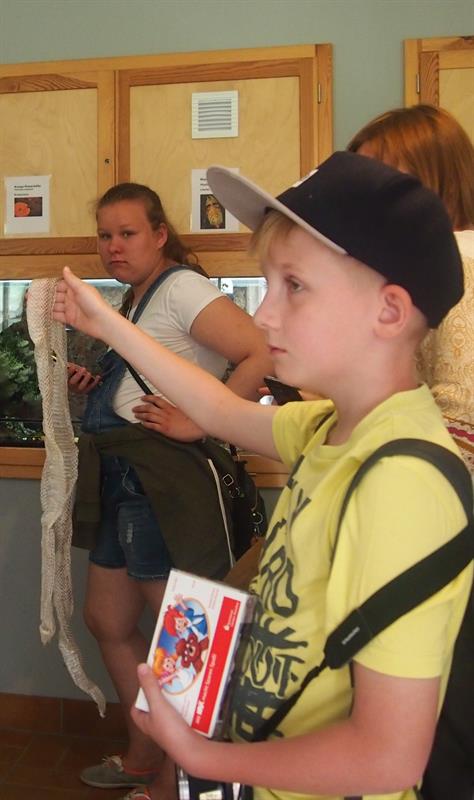 Gdy pani wyciągała karaczana, musieliśmy być cichutko, bo one nie lubią hałasu. Na koniec mogliśmy potrzymać skórę węża. Przypominała papier. Świat owadów jest pasjonujący, a skóra węża okropna.