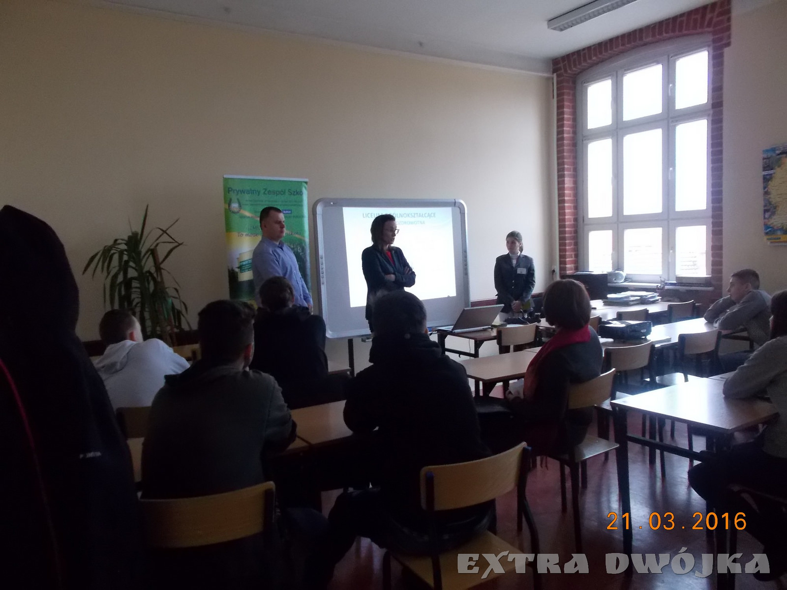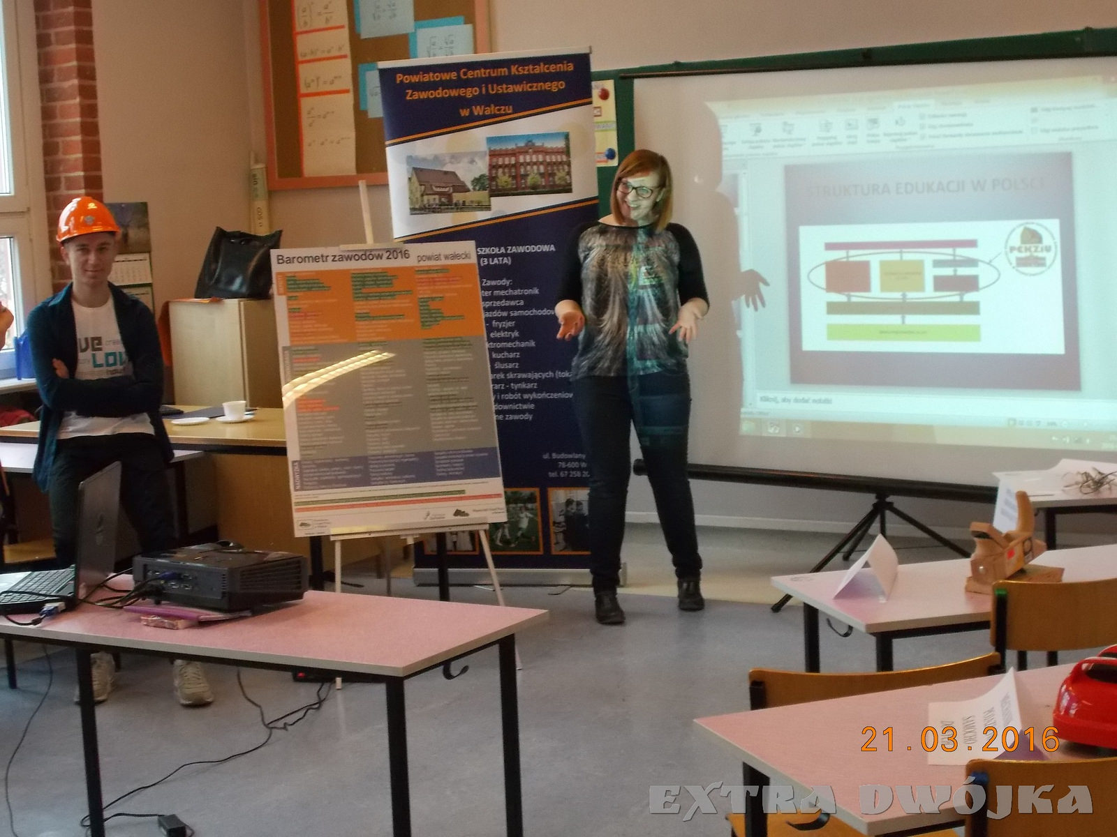 W godzinach od 10:40 do 11:25 odbyły się spotkania w sali konferencyjnej z dobrym duchem szkoły - psychologiem panią Anną Dyczko, która motywowała, wspierała, radziła, jak żyć, by osiągnąć sukces w przyszłości. Panie z Urzędu Pracy opowiedziały klasom trzecim o aktualnej sytuacji na rynku pracy, by uczniowie byli świadomi, jakie są aktualne potrzeby na wałeckim, polskim i światowym rynku. Od godziny 11:35 do 13:30 trwały spotkania z uczniami ze szkół średnich z terenu miasta Wałcza i okolic: Czarnkowa, Starej Łubianki i Trzcianki. Uczniowie w sposób przystępny, obrazowy, przedstawili profile klas, w których się uczą. Przybyli do nas uczniowie Zespołu Szkół nr 3, Zespołu Szkół nr 1, Zespołu Szkół nr 2, Zespołu Szkół nr 4 Rolniczego Centrum Kształcenia Ustawicznego. Wszyscy wspólnie stwierdzili, że to był bardzo udany dzień, który dał wiele satysfakcji uczniom i zaproszonym gościom. Uczniowie klas III zostali wyposażeni w pakiet informacji teoretycznych i praktycznych na temat wyboru szkoły i profilu klasy.