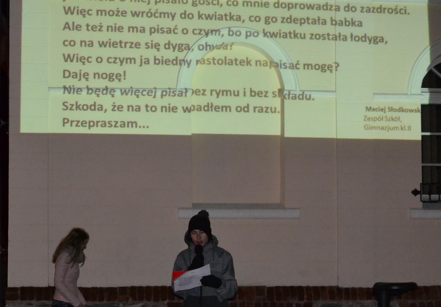 Największe obawy organizatorów pojawiły się po godz. 18, kiedy niebo nad rynkiem zasnuły ogromne czarne chmury, a gwałtowne porywy wiatru wprowadziły nieco zamieszania w uczniowskich szeregach. Na szczęście równo o godz. 19, a więc w momencie rozpoczęcia imprezy, aura zaczęła sprzyjać miłośnikom poezji.