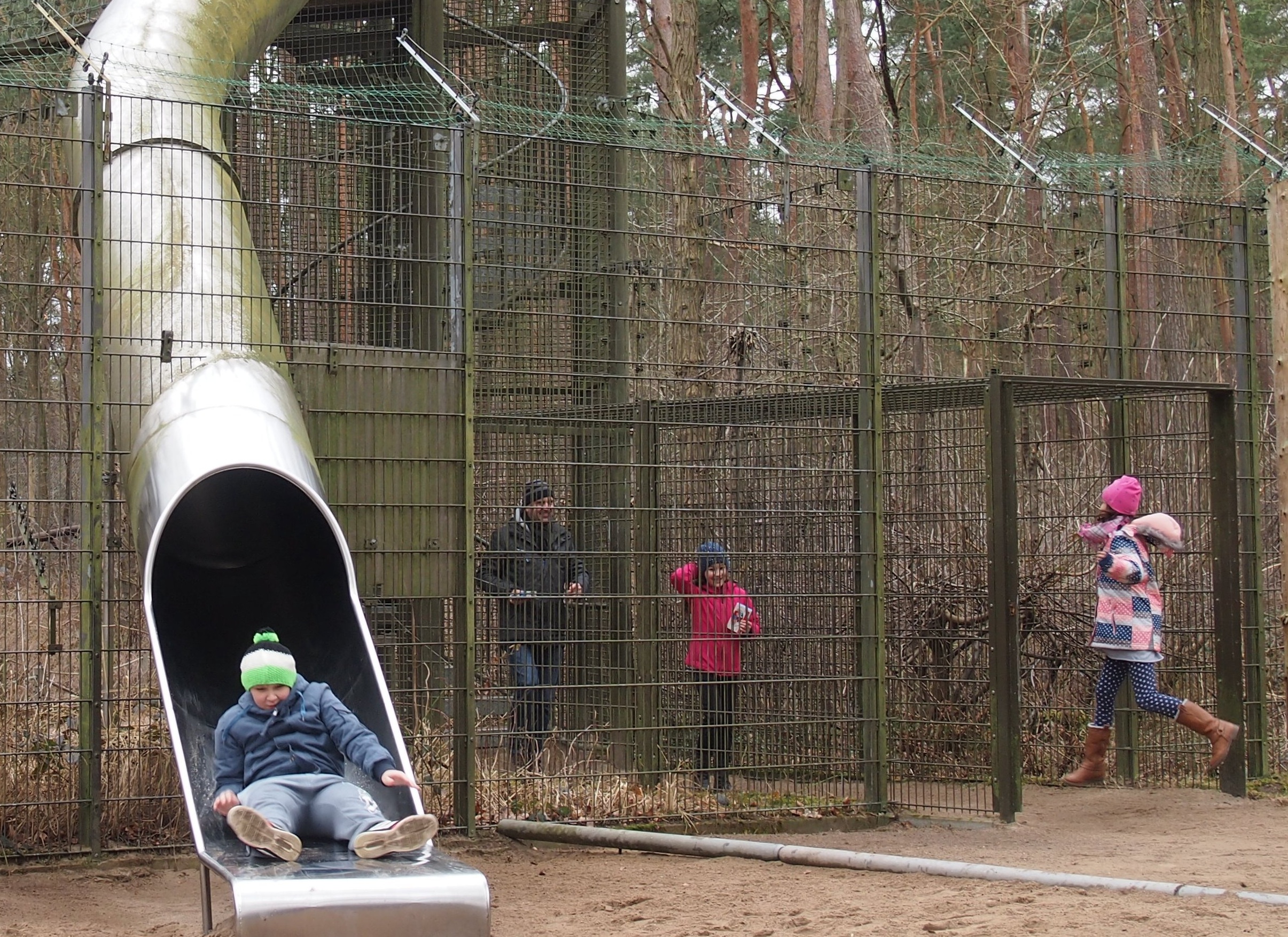 Kiedy byłam w Uckermünde dwa lata temu, szczególnie spodobały mi się małe kózki. W tym roku też je zastałam. Najmłodsza z nich wydawała słodkie dźwięki. Niestety, zabrakło nam czasu na obejrzenie wszystkich zwierząt, ale i tak byliśmy zadowoleni. Ostatnie dziesięć minut spędziliśmy na placu zabaw. Każdy z nas zaliczył upadek, wszyscy w tym samym czasie i miejscu, co było bardzo zabawne. Stało się to na kole, które kręci się w przeciwną stronę, niż my idziemy. Przeszliśmy nad małpim gajem, a tak dokładnie po „ruchomym moście” znajdującym się nad terytorium małp. Zakończony był rurą do zjeżdżania. Po powrocie do budynku wspólnie ustaliliśmy, których zwierząt z mapy nie ma w zoo.