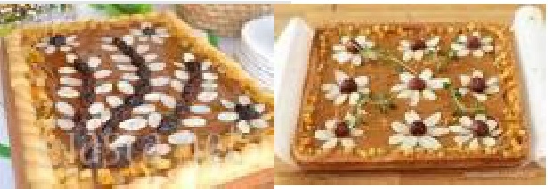 Składniki: 250 g mąki, 160 g masła, 100 g cukru pudru, dwa żółtka, pół puszki gotowej masy kajmakowej Bakalland, sparzone i obrane migdały, suszona gruszka moczona przez 10 min w gorącej wodzie.