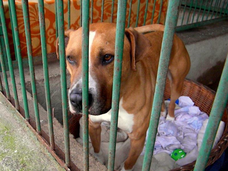 Za kratami siedzi osowiały. Gdy tylko opiekun zabierze go na spacer, psiak o smutnym spojrzeniu zmienia się w pogodnego bata łatę, radość okazującego całym rozmerdanym ciałem.